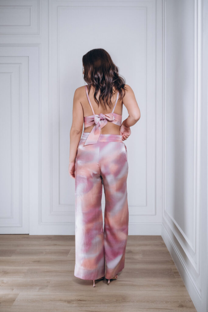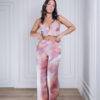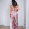 Um Loungewear que é puro glamour. Composto por top curto estilo bralette e calças de perna larga, este conjunto em cetim combina conforto e sofisticação. A estampa marmoreada em tons suaves e brilhantes acrescenta modernidade e luxo, tornando-o perfeito para relaxar com elegância ou surpreender em momentos especiais.