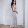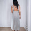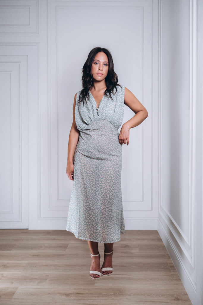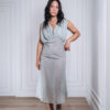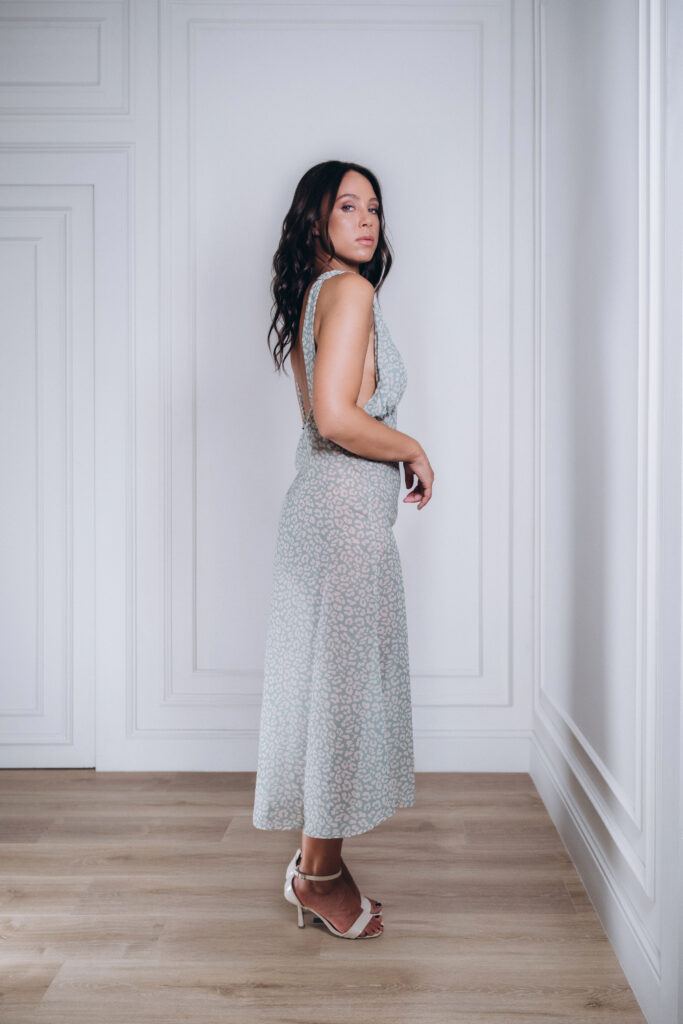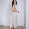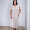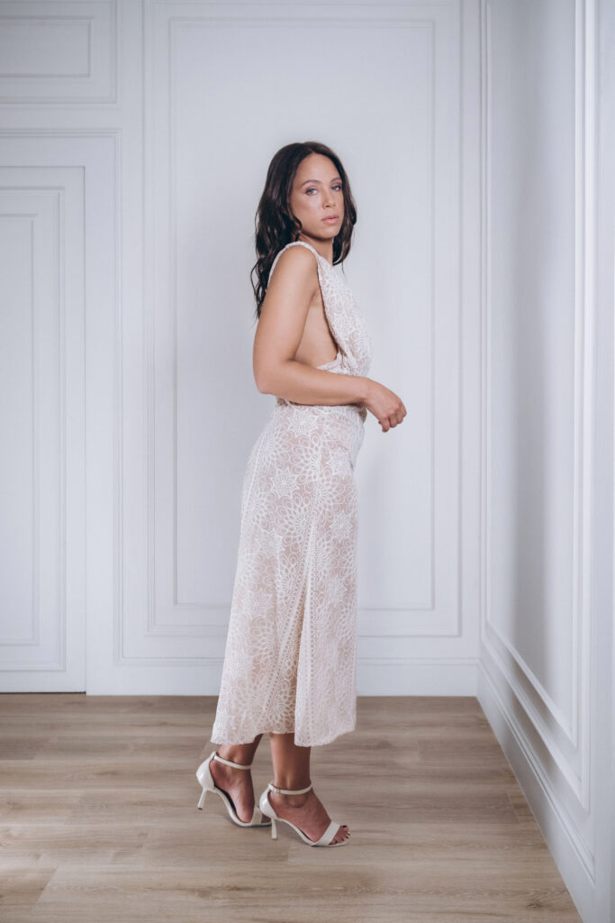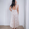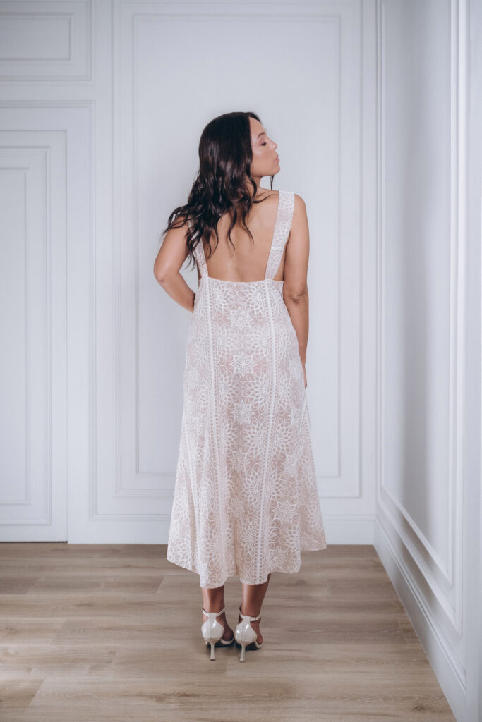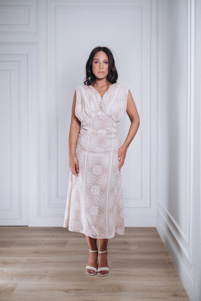 A peça possui decote trespassado com drapeado suave, que valoriza o colo com elegância, e modelagem fluida com cintura marcada, proporcionando um caimento que abraça o corpo com leveza. A saia midi, com recortes verticais em renda, alonga a silhueta e oferece movimento com graciosidade.