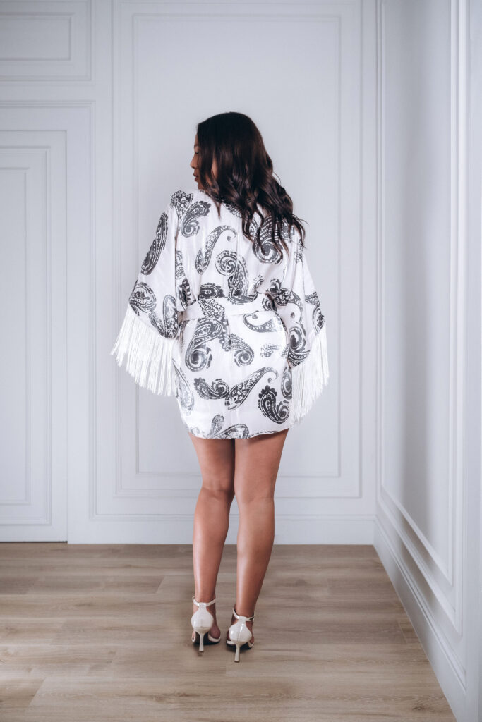 O Kimono Íris é a peça-chave para transformar qualquer look em uma produção sofisticada e descontraída. Confeccionado em tecido leve com estampado paisley em preto e branco, traz um caimento fluido e delicado. O destaque fica por conta das franjas longas nas mangas, que acrescentam movimento e um toque boho-chic à peça.