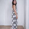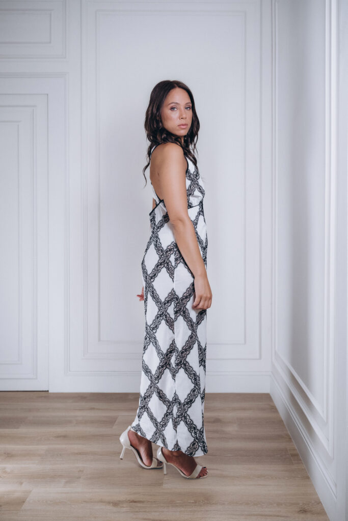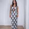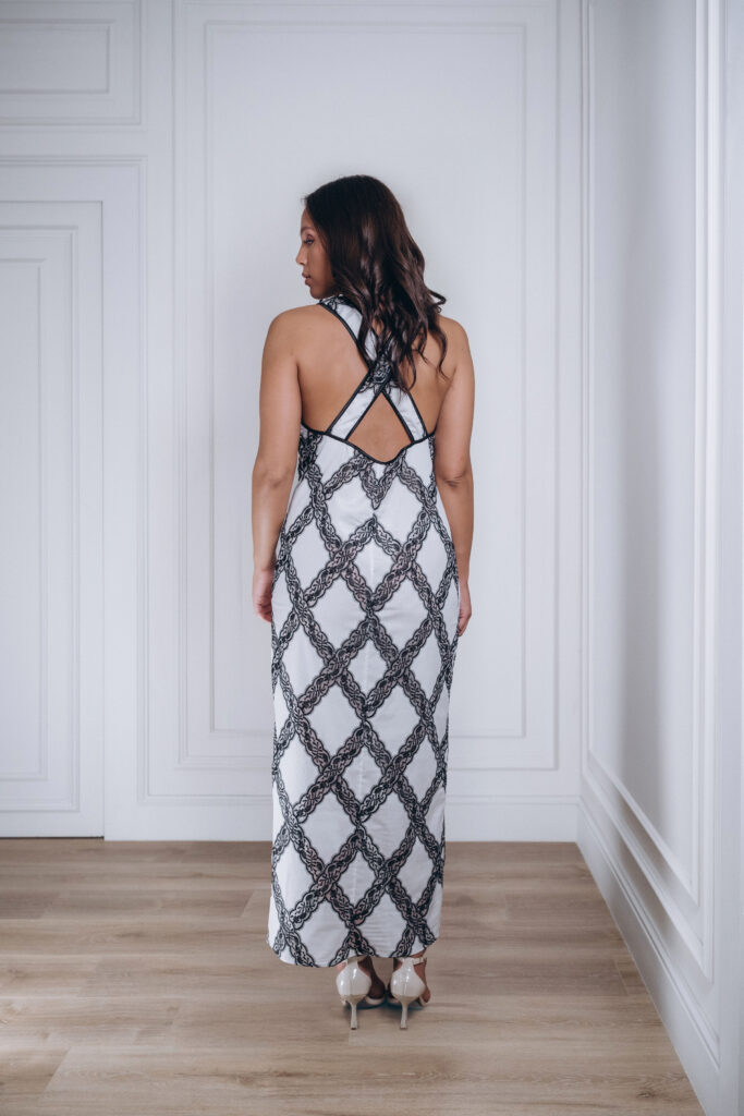 Um design que une sofisticação e sensualidade. Esta camisa longa em preto e branco apresenta um padrão exclusivo em efeito renda, com recorte frontal delicado que revela discretamente a pele, realçando a feminilidade de forma elegante. O decote em V profundo alonga a silhueta, enquanto o caimento fluido traz conforto e leveza.