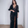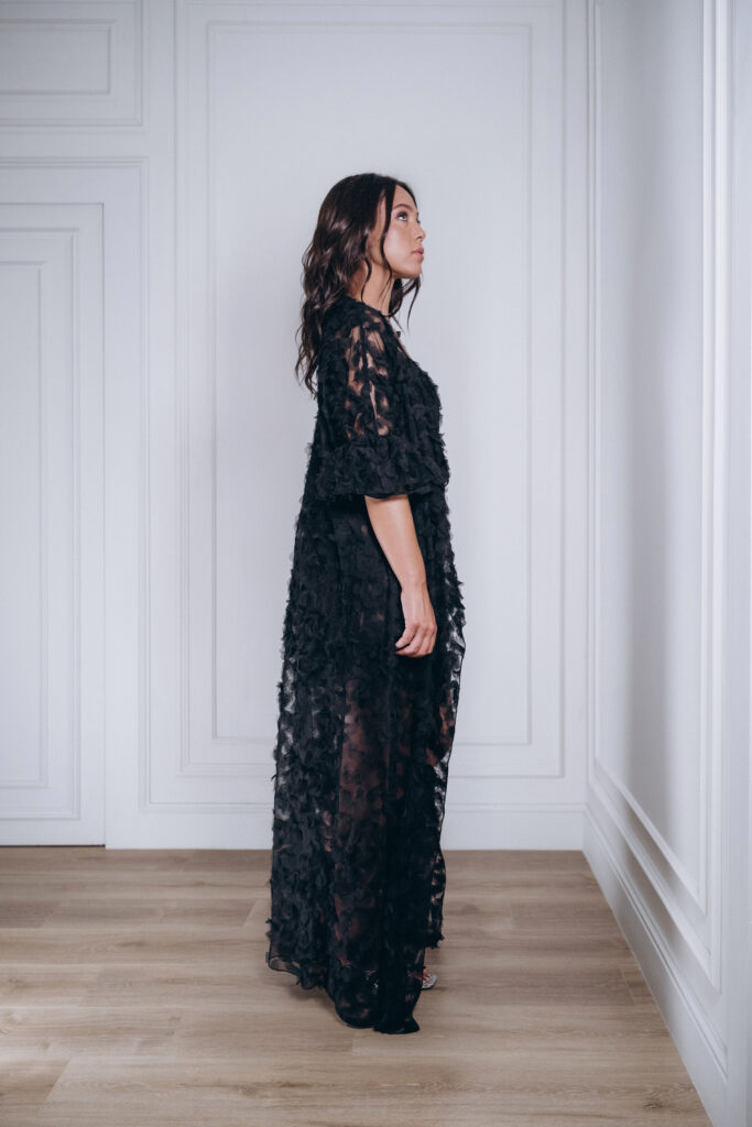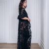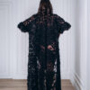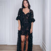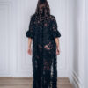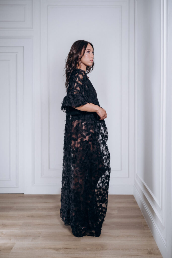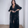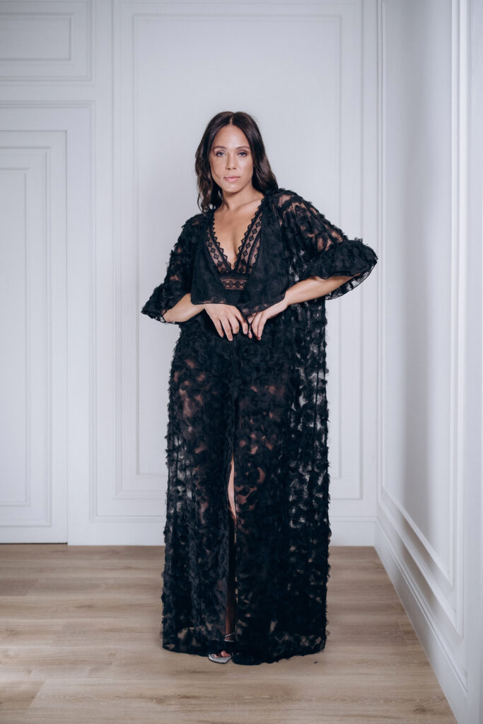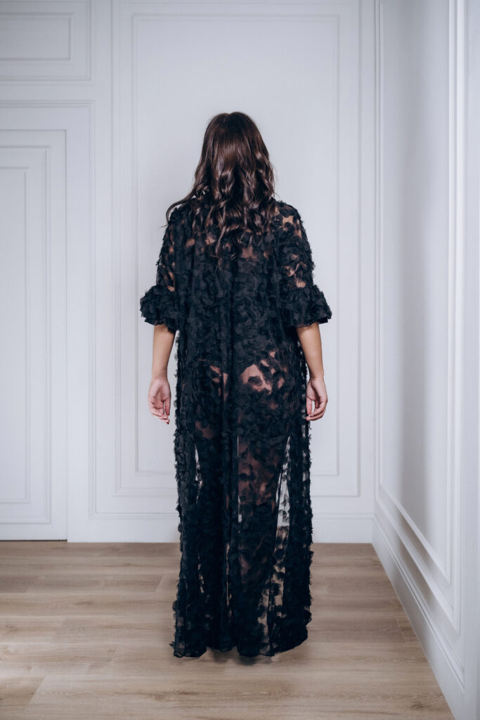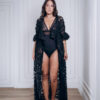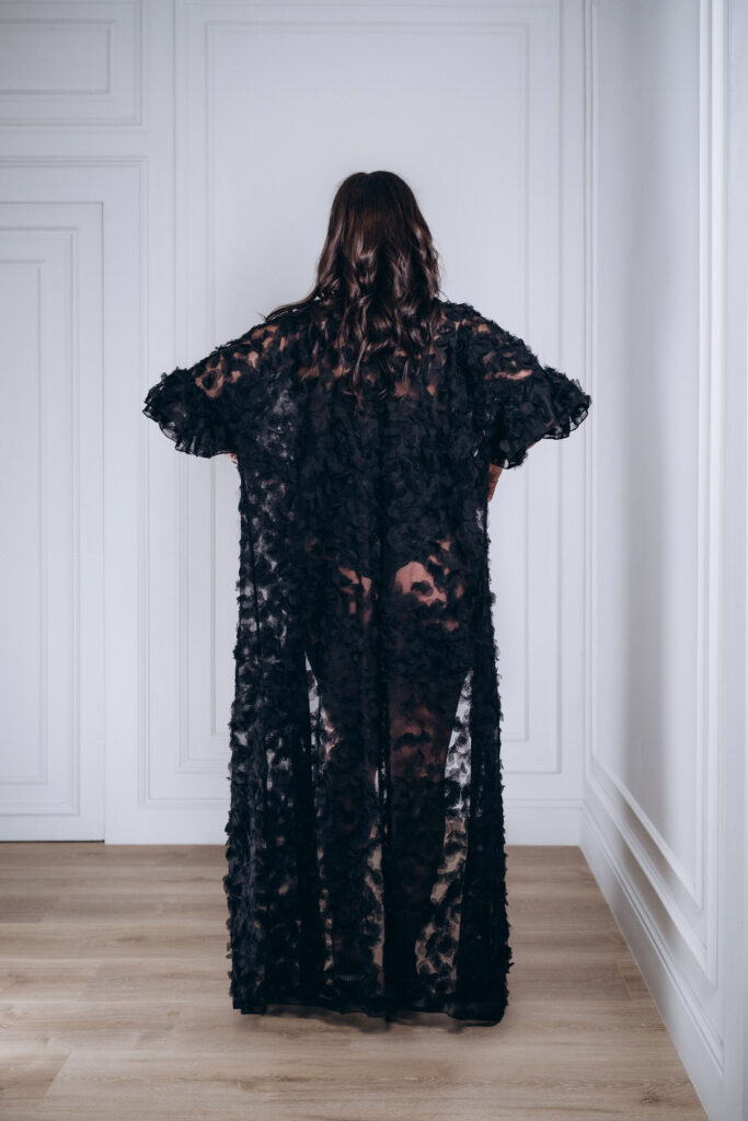 Com modelagem longa e fluida, mangas amplas e abertura frontal, ele transforma qualquer composição íntima em um momento de arte e presença. A textura orgânica sobre o tule cria movimento e enquanto dimensão, transparência convida ao toque e ao olhar.